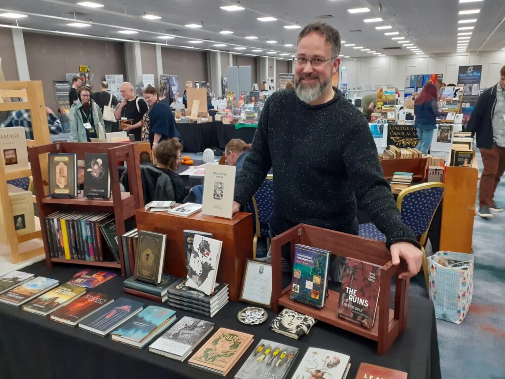 The press was nominated this year for a British Fantasy Award in the “Best Independent Press” category. It’s always an honour to be nominated for an award, and I’ve noticed it’s happening more in recent years. We didn’t win this time around, but I did enjoy spending time in Brighton at the World Fantasy convention, where we were sat besides our colleagues from Tartarus Press and Zagava. And our friend Steve J. Shaw, who takes care of Swan River’s typesetting duties, had better luck in Brighton, picking up a World Fantasy Award in the “Special Award—Non-Professional” category for his work with Black Shuck Books. Congratulations, Steve!