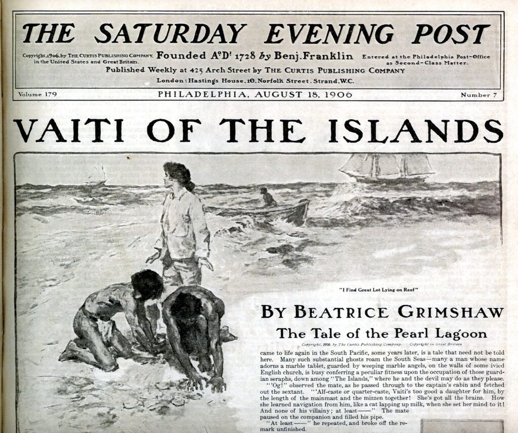 MA: She had written some fiction, but not much. Her writings were mostly journalism, reviews, and articles for various Irish magazines and newspapers. But once she reached the South Seas, travelling around the many islands before settling down, she was inspired, particularly by the idea of an adventurous woman amongst the travellers, settlers, and the indigenous peoples on those islands—Samoa, Fiji, the New Hebrides, Papua, and so on. She had immediate success with her first South Seas novel, Vaiti of the Islands, which was serialised in the Sydney Morning Herald and the Saturday Evening Post in 1906, and was picked up by the British Pearson’s Magazine in 1907. It concerns a young woman who becomes a “native queen”.