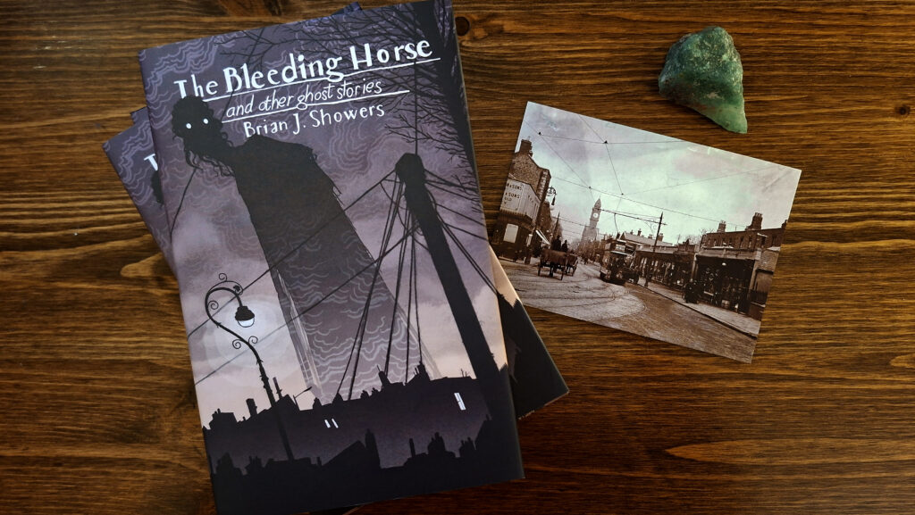 The Bleeding Horse and Other Ghost Stories by Brian J. Showers; cover art by Brian Coldrick; cover design by Meggan Kehrli; foreword by John Connolly; introduction by Jim Rockhill; copyedited by Jim Rockhill; typeset by Steve J. Shaw; published by Swan River Press.